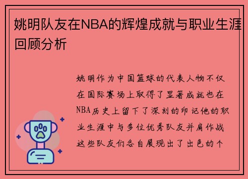姚明与何斐的合作,标志着中国篮球发展进入了一个全新的时代。他们不仅在技术层面上提升了篮球运动的水平,同时也在文化传播和国际影响力方面做出了巨大贡献。姚明作为中国篮球的代表性人物,凭借其卓越的球技和广泛的影响力,为中国体育赢得了更多的关注。而何斐则以其深厚的专业知识和对市场的敏锐洞察,与姚明共同推动着篮球文化向世界传播。在这篇文章中,我们将从四个方面详细探讨他们如何携手共创篮球新篇章,从而推动中国体...